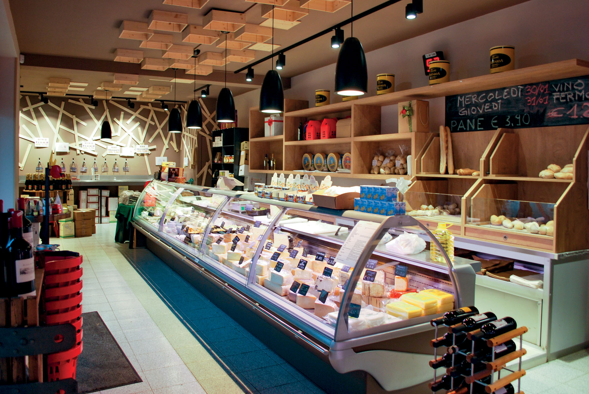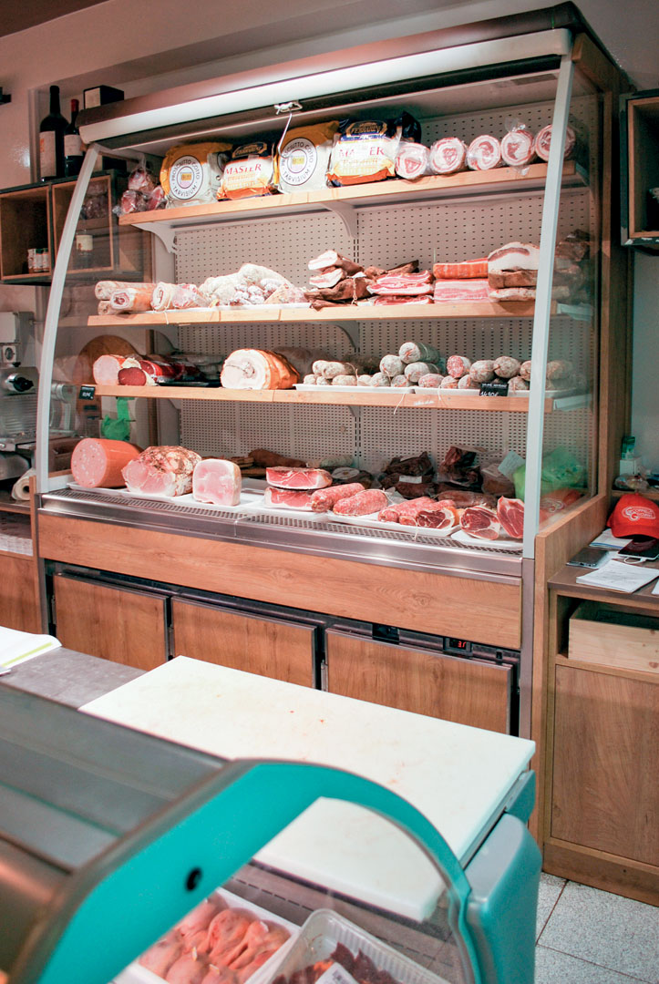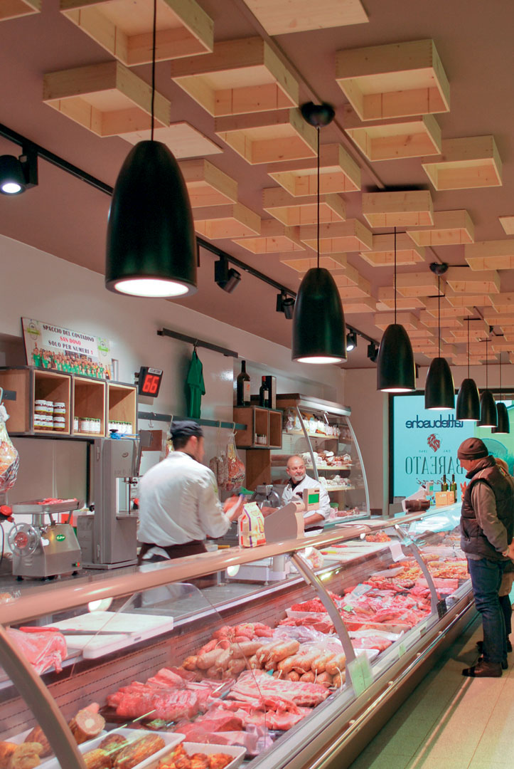 Il progetto proposto al cliente prevedeva la creazione di un ambiente in stile industriale abbinando la tonalità calda del rovere con il ferro delle scaffalature e delle maniglie utilizzate per l’esposizione dei loro prodotti, in contrasto con le piastrelle bianche tridimensionali che ricordano le macellerie di una volta.