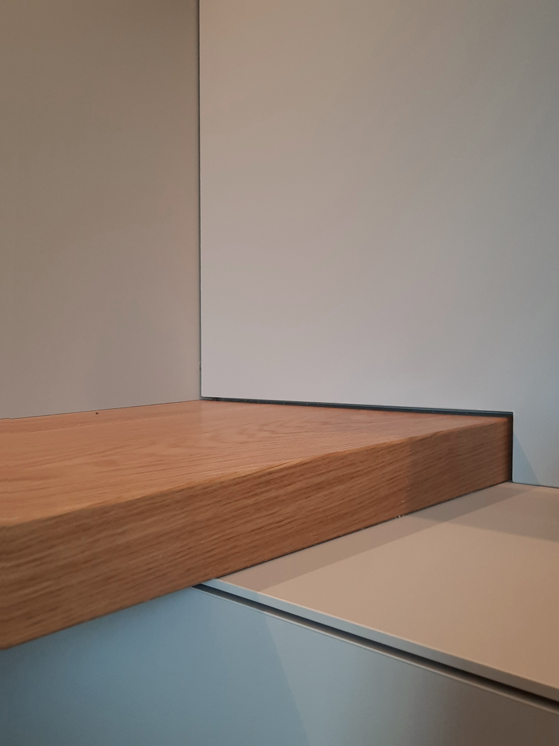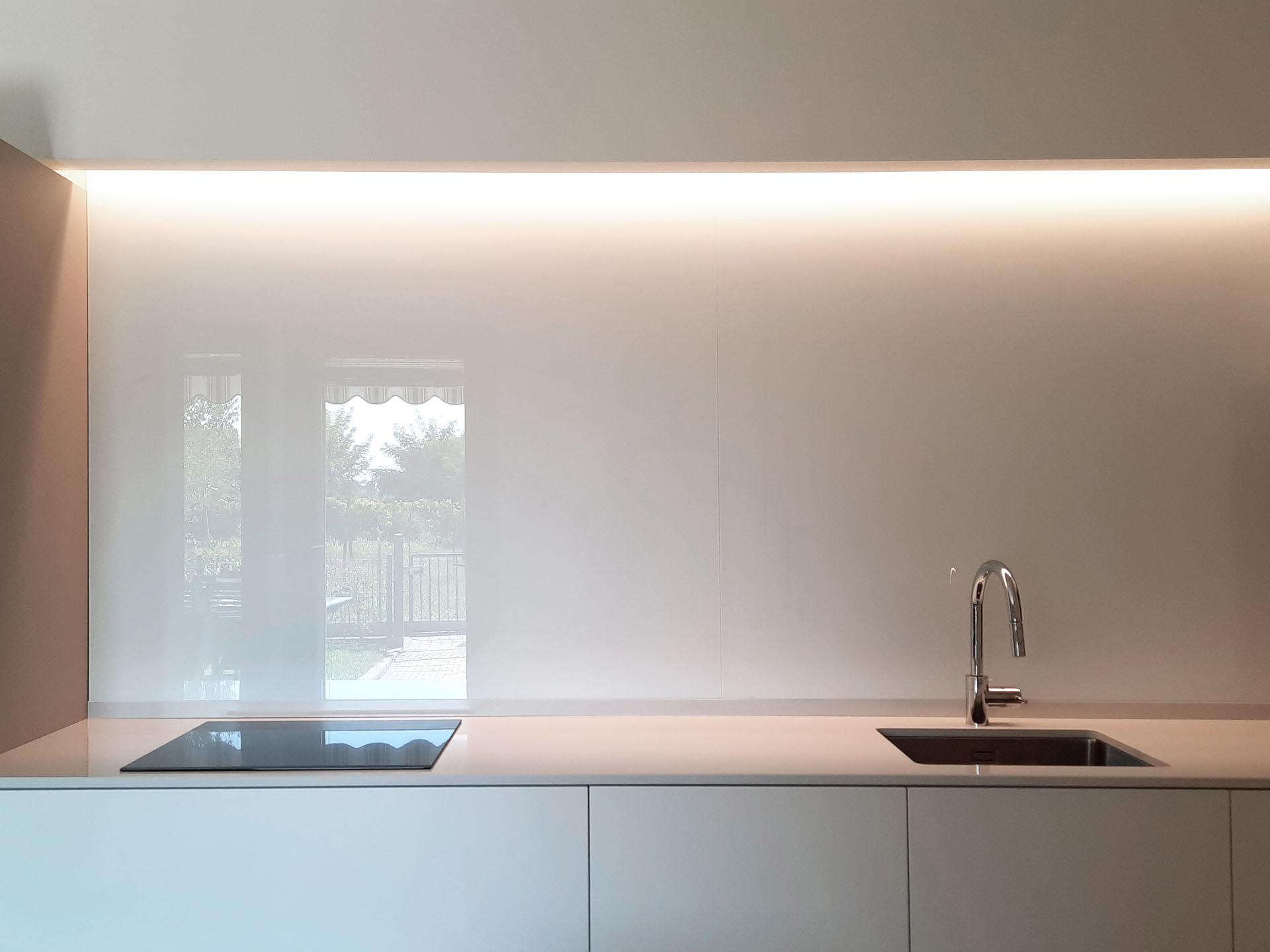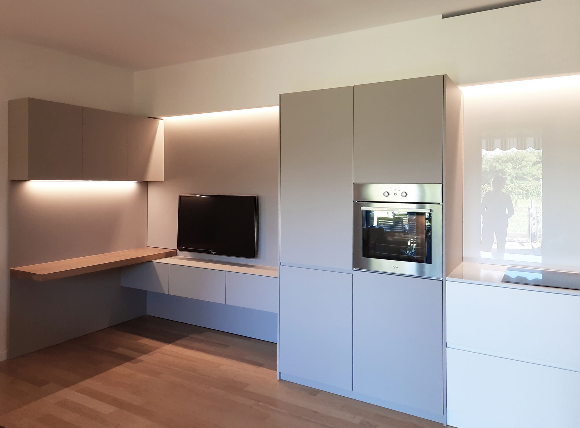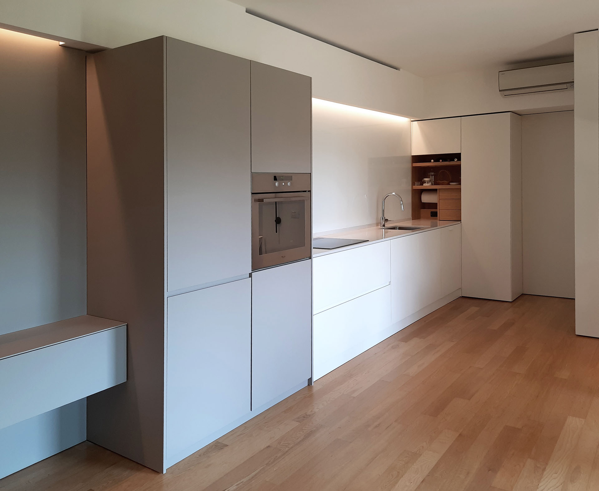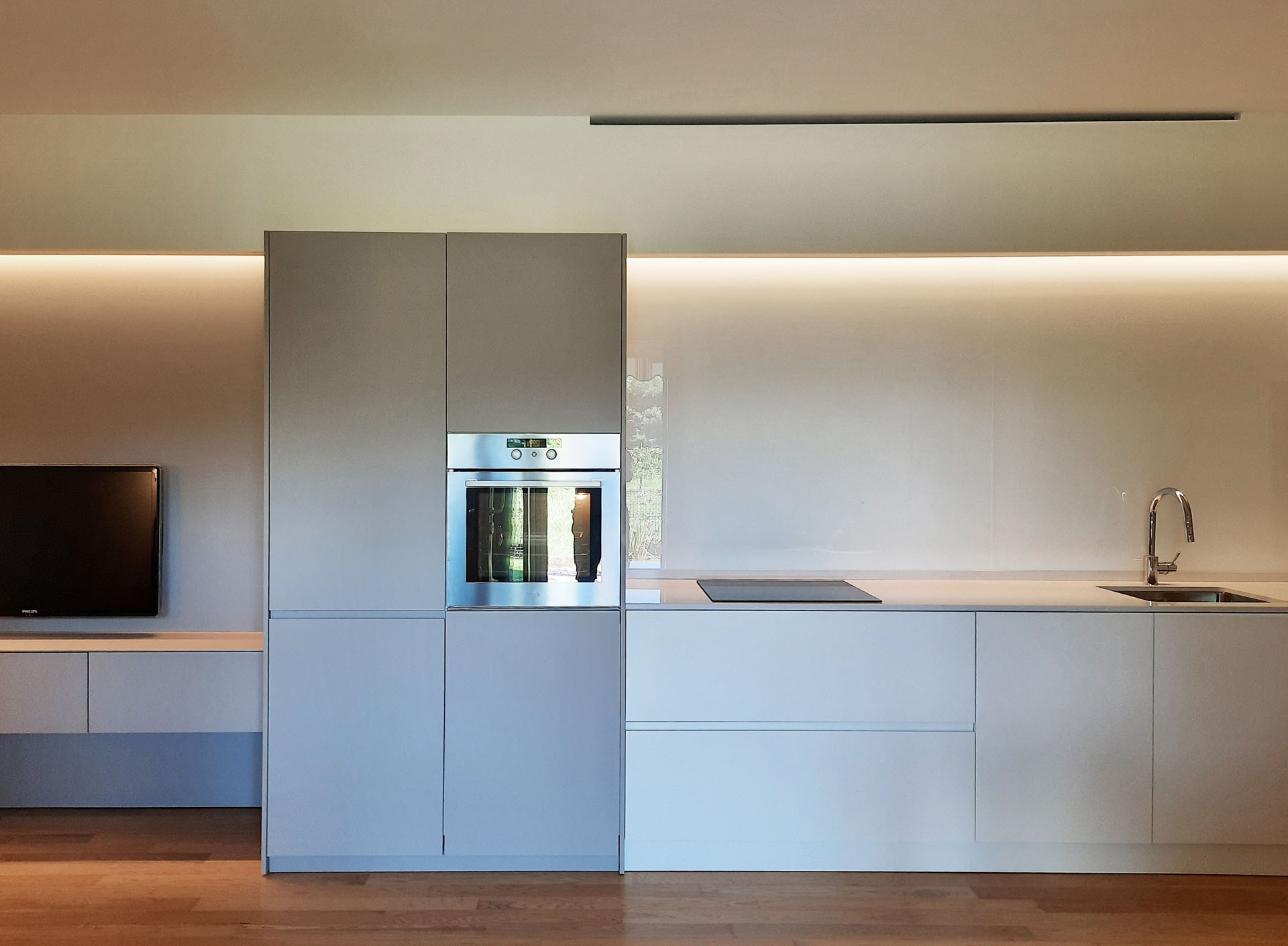 Il progetto, firmato dal designer d'interni Paolo Russo, presenta forme minimal dalle linee essenziali. Il contrasto tra legno al naturale e legno verniciato bianco vanno a formare un movimento armonioso che culla lo sguardo. L'estrema cura nei dettagli e la funzionalità degli spazi caratterizzano gli interni di questa casa.