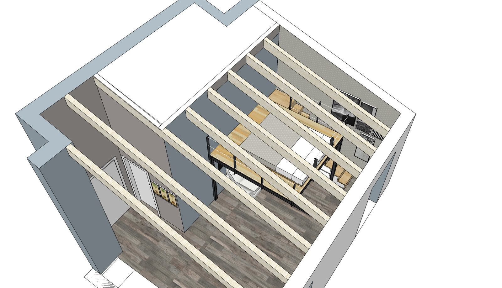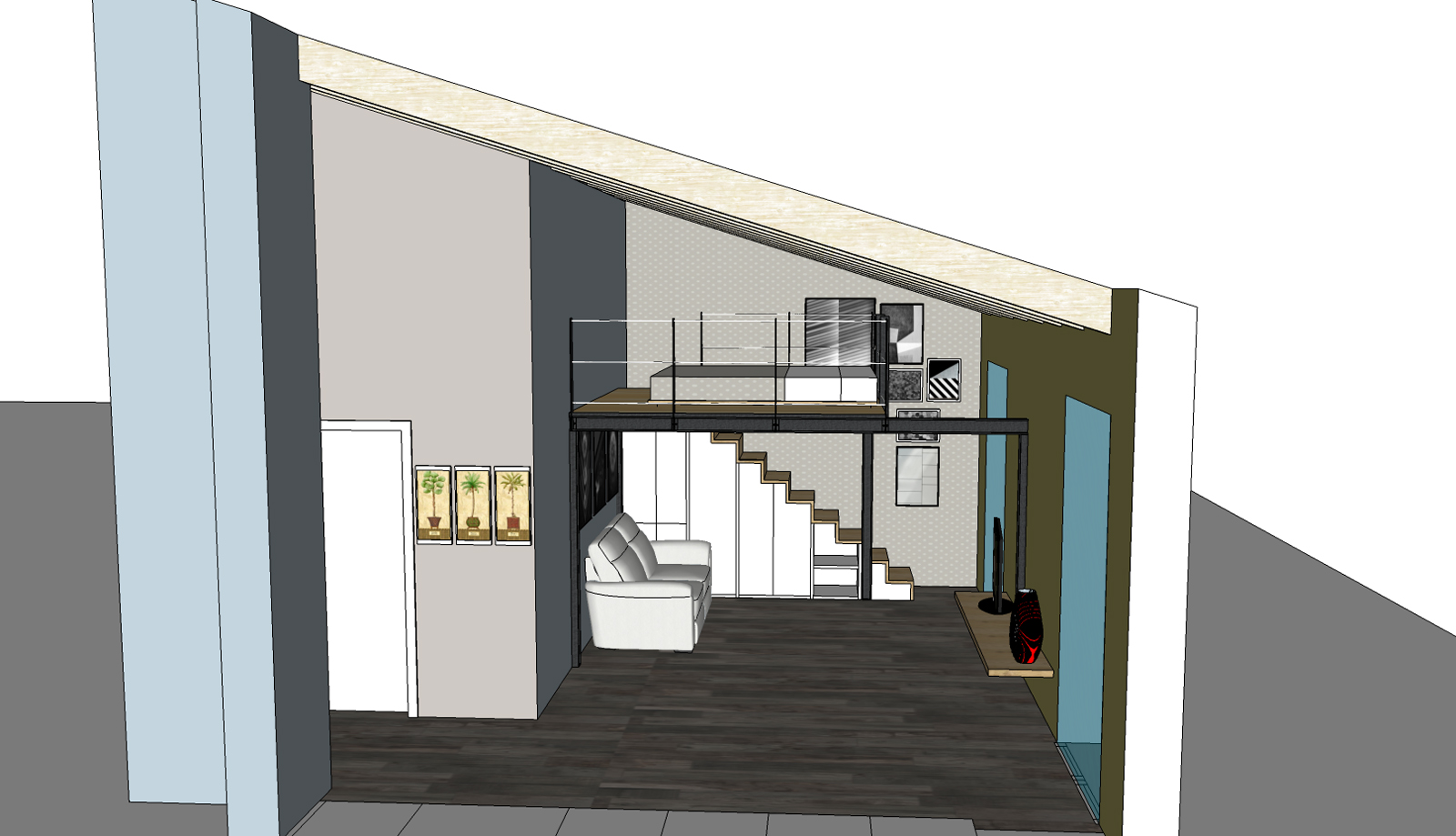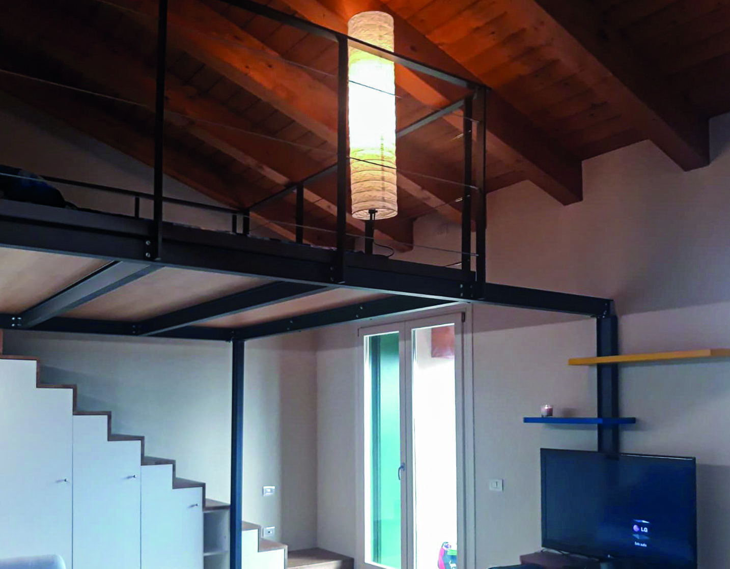 Il cliente ha richiesto una struttura per creare una camera da letto “insolita” all’interno della propria mansarda. E’ stata proposta una struttura portante in stile industriale ancorata al muro per scarico laterale, creando una scala in rovere massello verniciato all’acqua, appoggiata alla mobilia sottostante creata ad uso armadio. Il soppalco è stato completato con la posa dei listoni in vero legno di rovere e il pilastro portante a muro è stato valorizzato con mensole laccate di colori diversi.