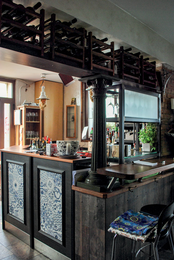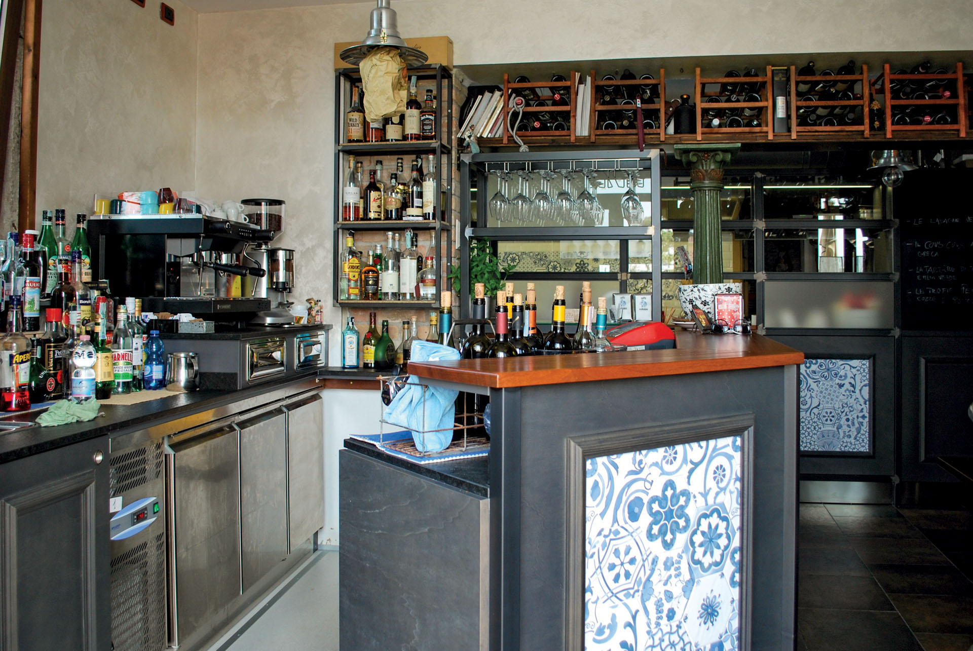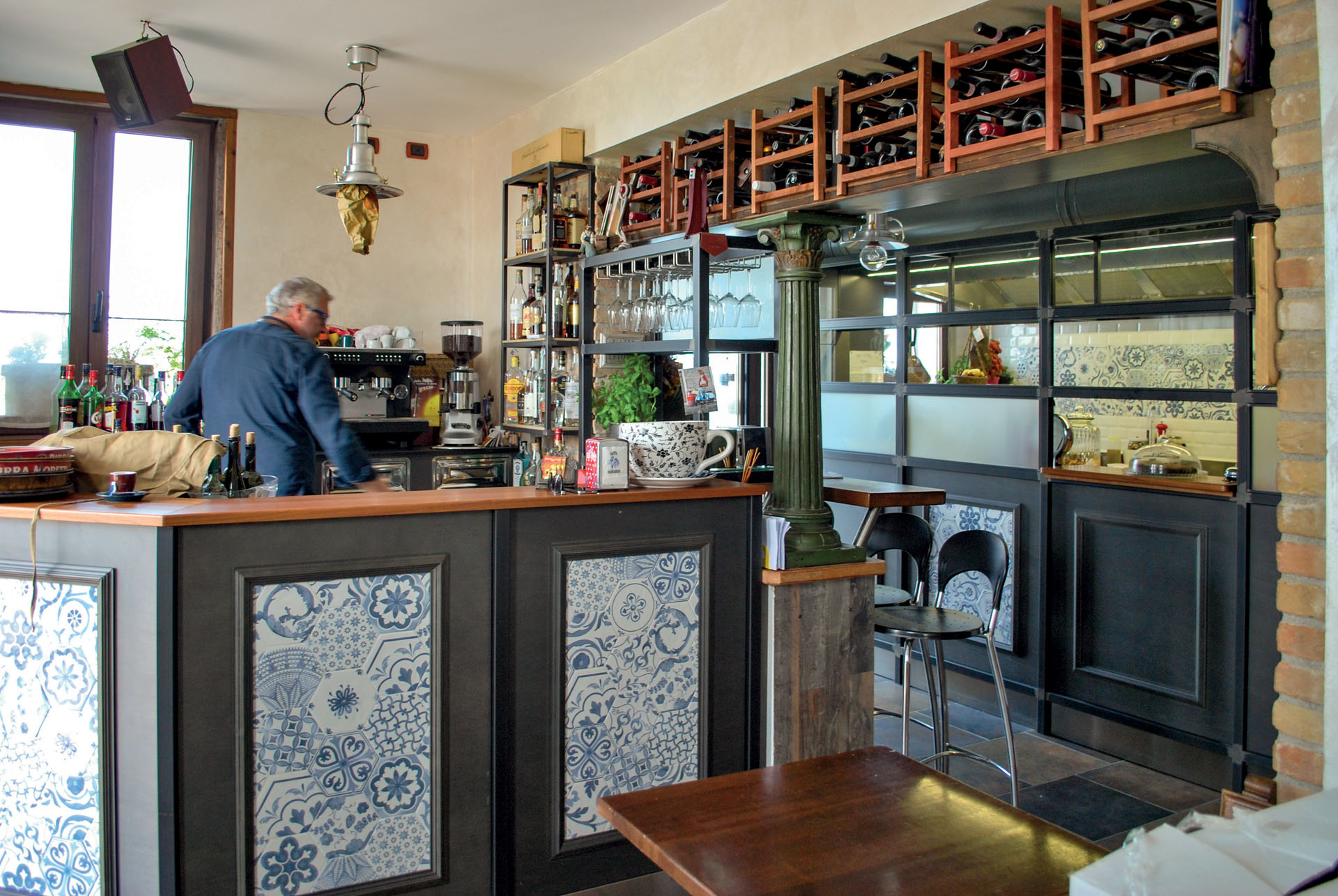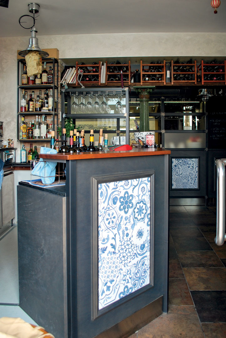 Il locale è stato realizzato con una fusione tra legno ed elementi che ricordano le maioliche. Il contrasto tra questi colori crea un ambiente con note fantasiose che rendono il bar accogliente e allegro.
