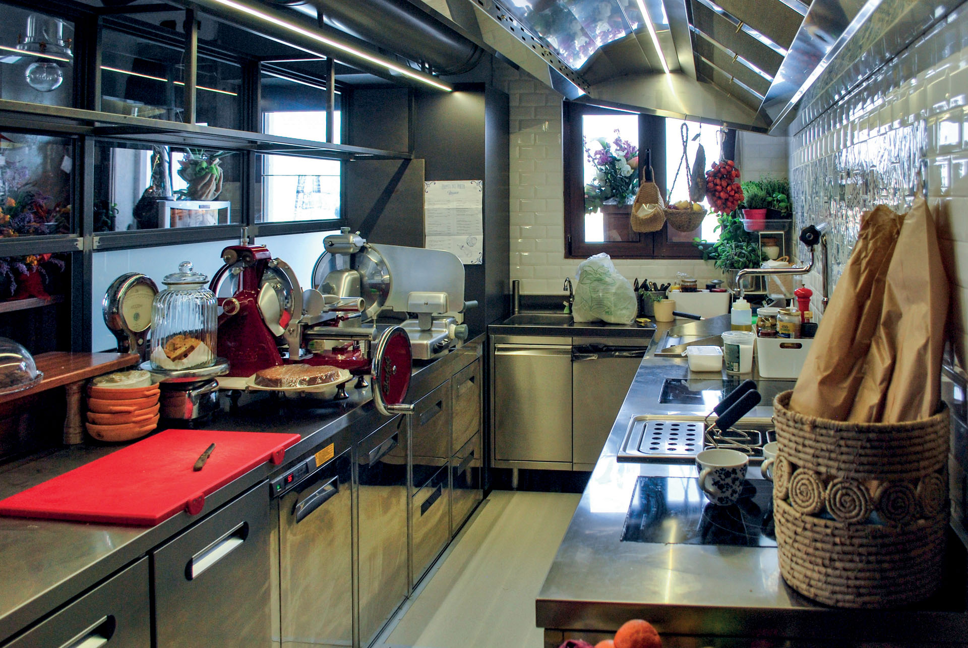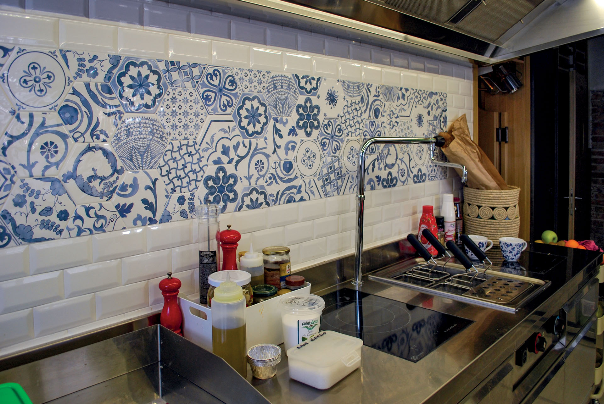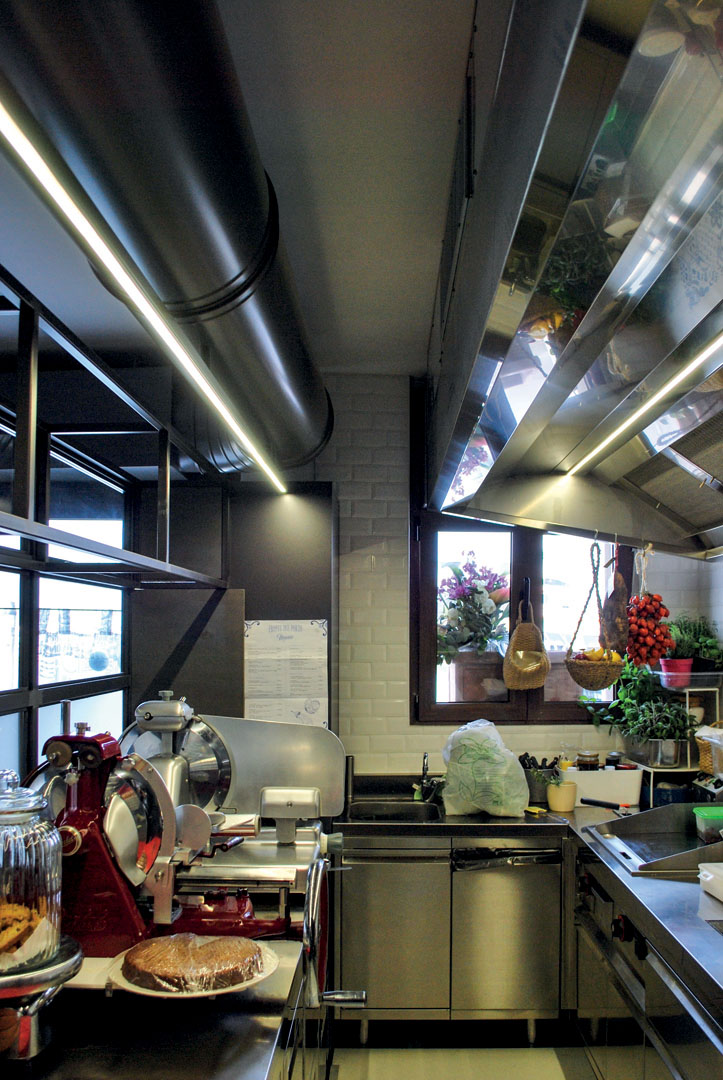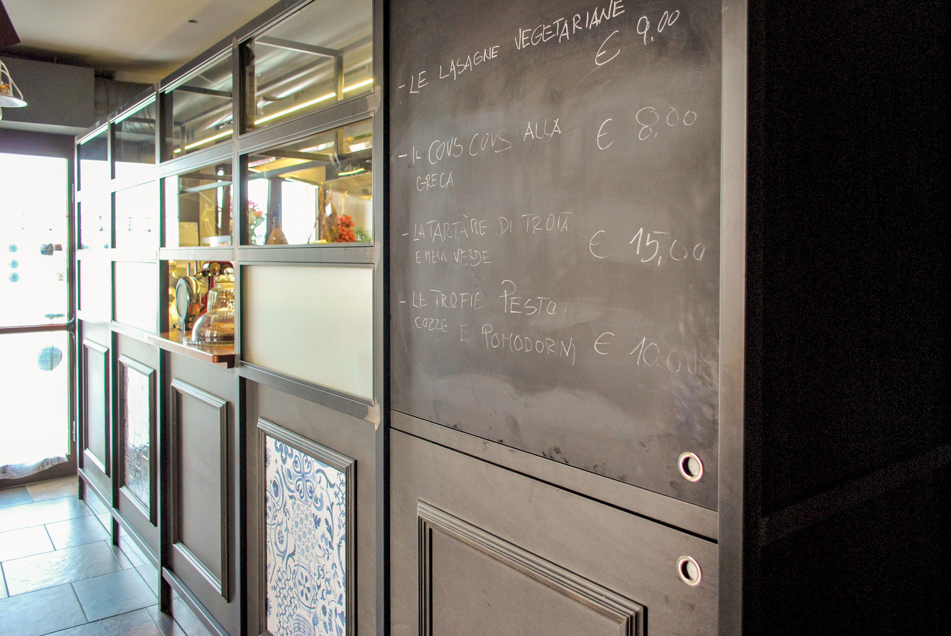 Il locale è stato realizzato con una fusione tra legno ed elementi che ricordano le maioliche. Il contrasto tra questi colori crea un ambiente con note fantasiose che rendono il bar accogliente e allegro.