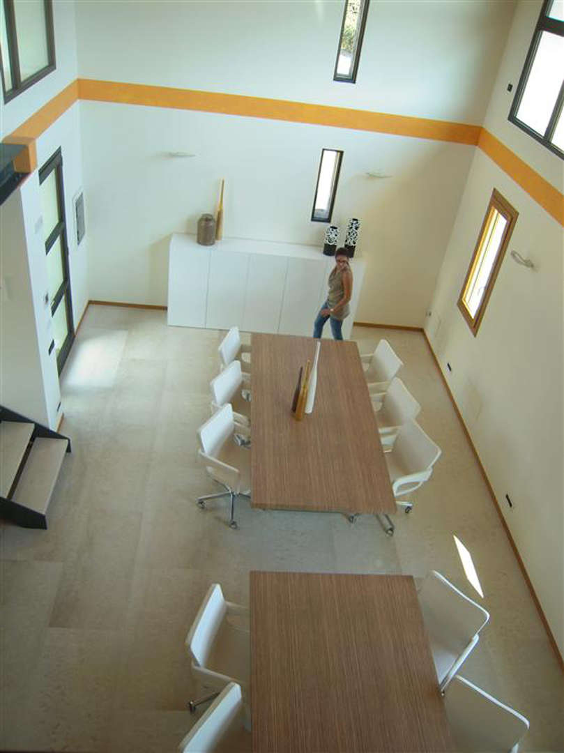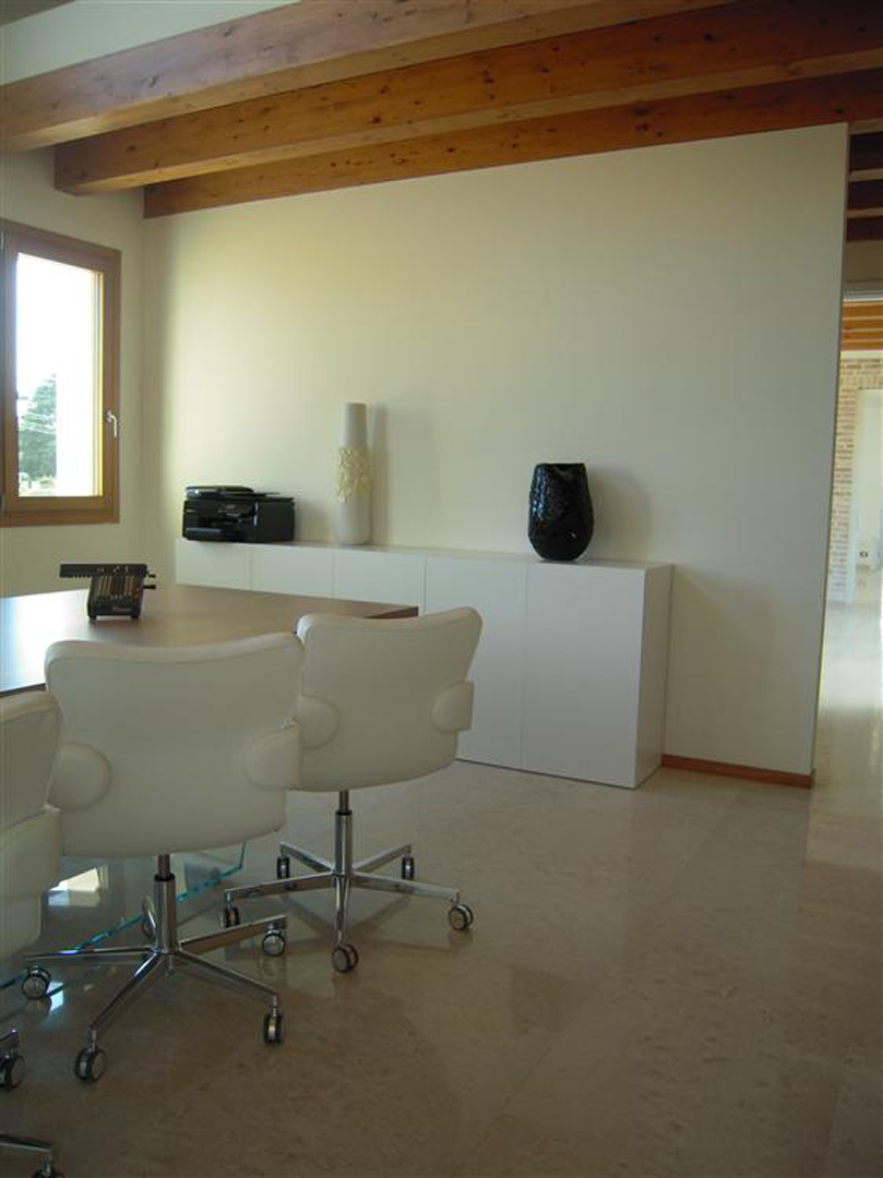 Per questa sala riunioni l'arredo utilizzato fonde superfici di legno con il vetro. Agli ampi tavoli al centro, sono stati aggiunti dei mobili in legno di colore bianco che completano l'ambiente.